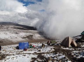 From the summit we begin our descent by continuing straight down to the Mweka Camp, stopping at Barafu for lunch. You may want gaiters and trekking poles for the loose gravel going down. We arrive at Mweka Camp and enjoy our last evening on the mountain.